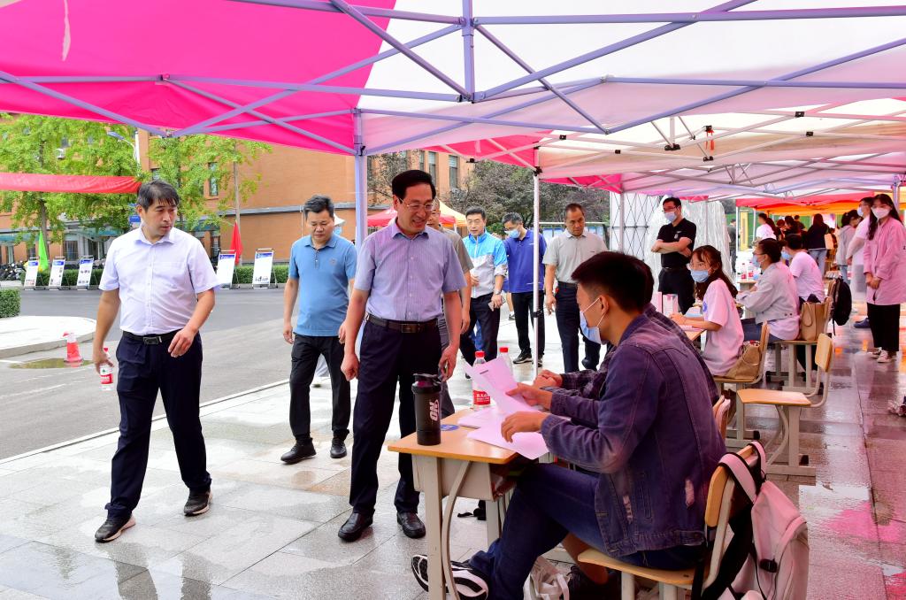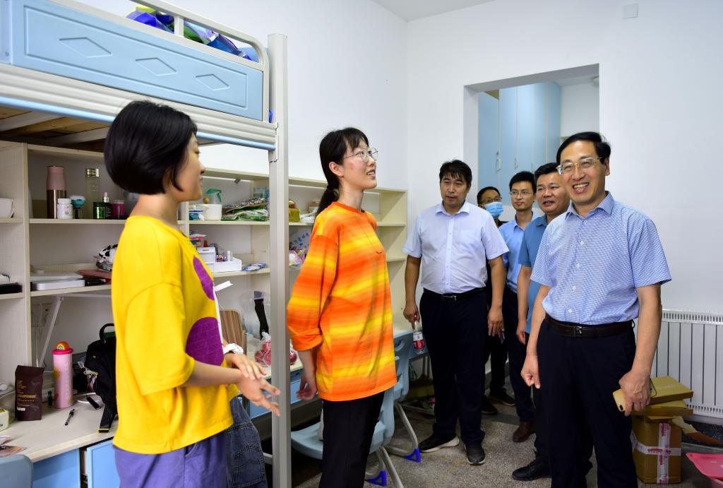 孫鶴汀與校區(qū)領導到迎新現(xiàn)場和學生宿舍慰問工作人員、志愿者和新生