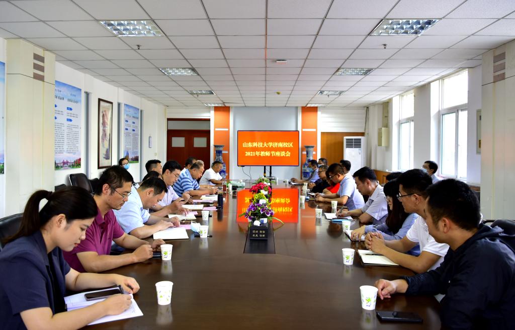 金風送歡笑,丹桂花香飄。9月10日,濟南校區(qū)在圖書館會議室舉行教師節(jié)座談會。校區(qū)黨委副書記賈長響,校紀委副書記鄒積強,校區(qū)管委副主任樊銘渠、孫國強,工會、教學科研部負責人,獲獎教職工代表、退休教師代表、新進教師代表等參加了座談會。座談會由樊銘渠主持。