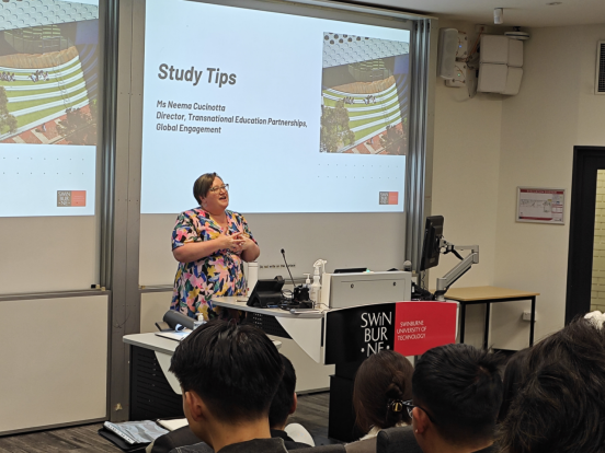 斯威本科技大學(xué)跨國(guó)教育合作部主任 Neema Cucinotta 女士等相關(guān)負(fù)責(zé)人為新生分享實(shí)用學(xué)習(xí)技巧,詳細(xì)介紹學(xué)術(shù)輔導(dǎo)、就業(yè)指導(dǎo)、健康關(guān)懷等學(xué)生支持服務(wù),助力快速適應(yīng)新環(huán)境。