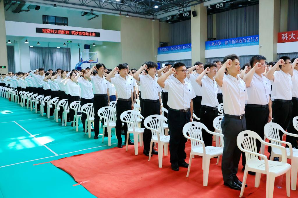 全體新生面對國旗莊嚴宣誓,在鏗鏘有力的青春誓言中,2025級新生開學(xué)典禮圓滿結(jié)束。