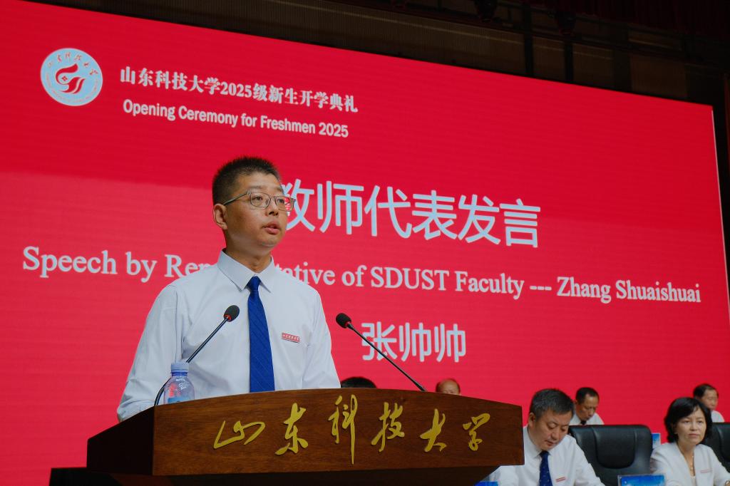 教師代表張帥帥發(fā)言,他分享了暑期帶隊參加全國機器人大賽的寶貴經(jīng)歷,希望同學(xué)們在中外合作辦學(xué)的優(yōu)質(zhì)平臺上“把根扎在山科的土壤里,把目光望向世界的遠方”,敢于啃學(xué)習(xí)中的“硬骨頭”,敢于在困境中對自己說“再堅持一下”,于爬坡過坎中積蓄力量,學(xué)有所成、夢想成真,度過一段充實而溫暖的大學(xué)時光。