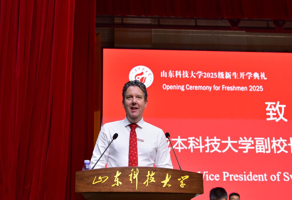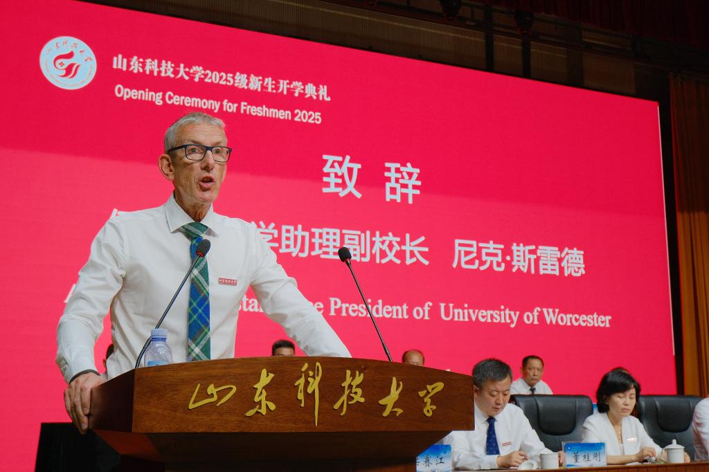 Nick Slade在致辭中表示,同學(xué)們將既受益于伍斯特大學(xué)嚴謹?shù)膶W(xué)術(shù)氛圍與支持性學(xué)習(xí)環(huán)境,又能汲取山東科技大學(xué)深厚的科學(xué)技術(shù)專長,希望大家探索全新思維方式,拓寬知識視野,提升跨文化能力,在全球化世界與日益激烈的就業(yè)市場中茁壯成長。