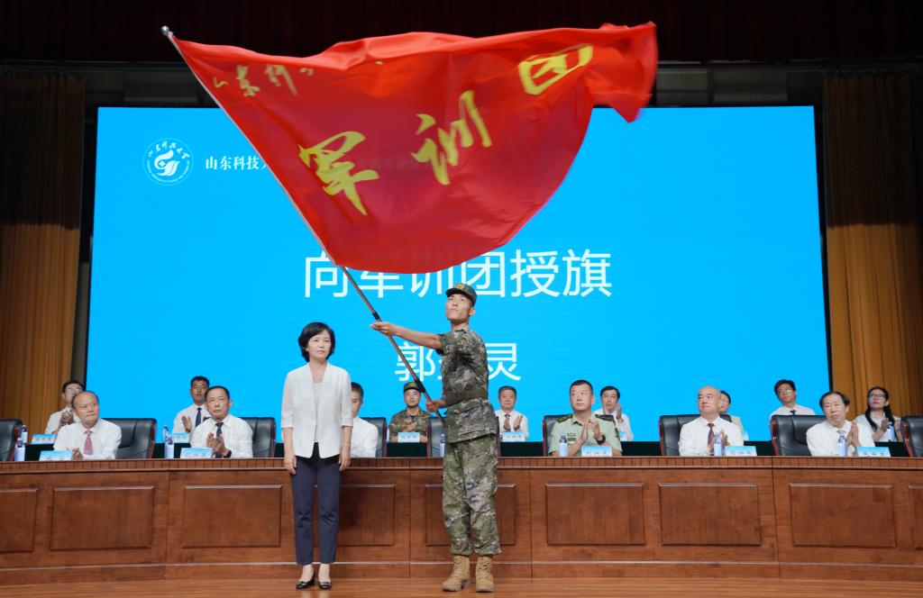 郭益靈向軍訓(xùn)團授旗。梁賽江宣讀《關(guān)于組織開展2025級學(xué)生軍事訓(xùn)練的決定》。