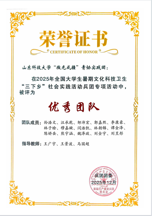 近日,2025年全國大學(xué)生暑期文化科技衛(wèi)生“三下鄉(xiāng)”社會實(shí)踐“衛(wèi)國戍邊兵團(tuán)行”兵團(tuán)專項(xiàng)活動順利結(jié)項(xiàng)。由濟(jì)南校區(qū)師生組成的山東科技大學(xué)“微光戍疆”青協(xié)實(shí)踐團(tuán)(指導(dǎo)教師:王廣宇、王景波、馬國超成為學(xué)校首次入選該專項(xiàng)活動的團(tuán)隊(duì),并在全國高校152支入選實(shí)踐隊(duì)伍中脫穎而出,榮獲“優(yōu)秀團(tuán)隊(duì)”榮譽(yù)稱號。實(shí)踐團(tuán)圍繞“青春助力兵地融合,數(shù)字賦能鄉(xiāng)村振興”主題,深入新疆生產(chǎn)建設(shè)兵團(tuán)基層一線開展調(diào)研實(shí)踐,形成了一系列具有現(xiàn)實(shí)針對性和實(shí)踐價(jià)值的成果,充分展現(xiàn)了濟(jì)南校區(qū)在社會實(shí)踐和實(shí)踐育人方面的扎實(shí)成效。