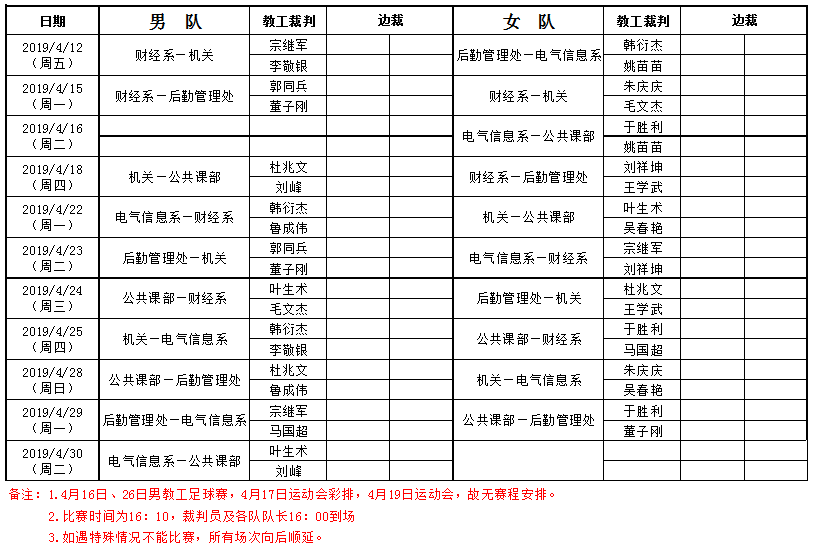 2019年濟(jì)南校區(qū)教職工排球比賽日程表—4.12更新