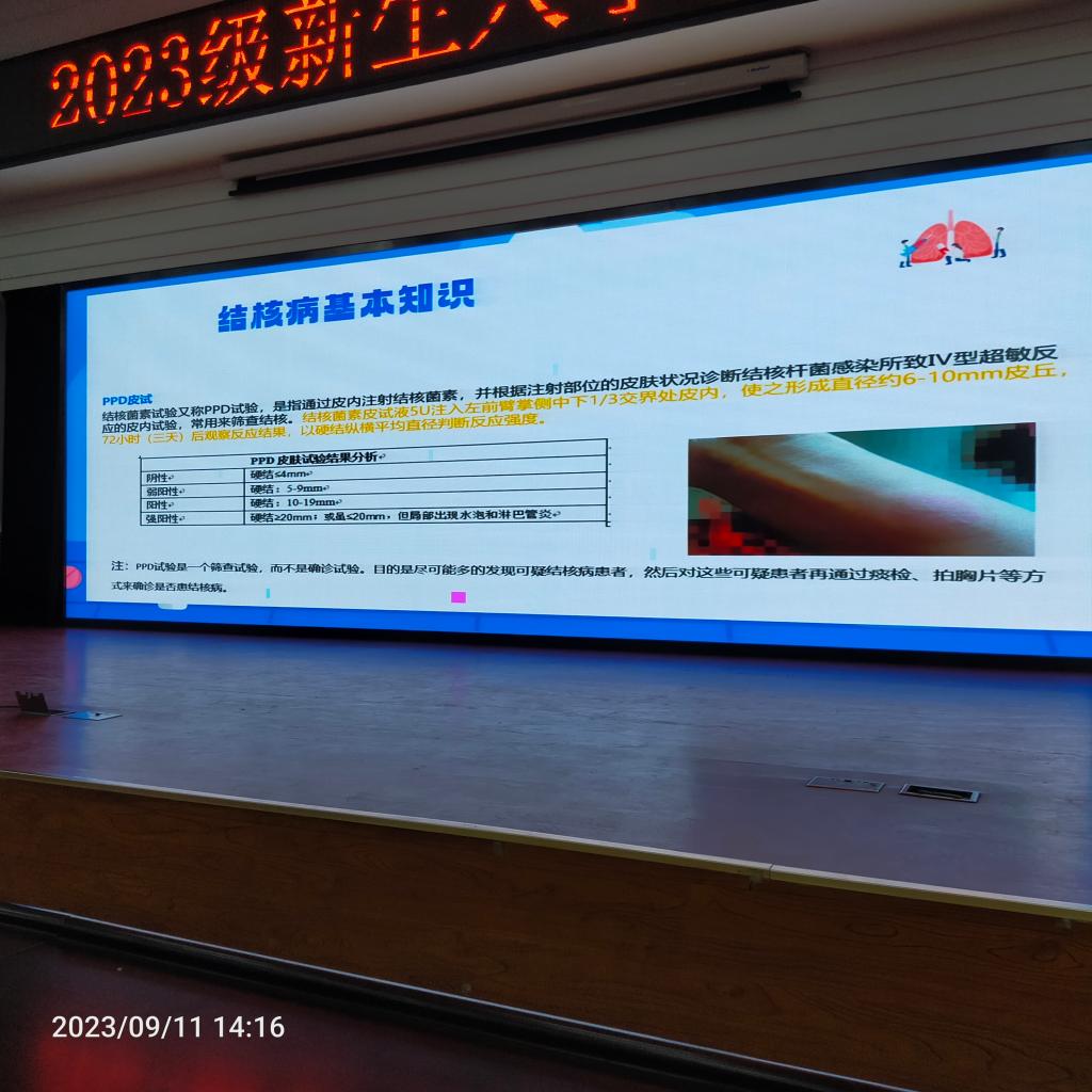劉倩醫(yī)師為同學(xué)們講解了肺結(jié)核的防治知識。劉倩醫(yī)師就結(jié)核病的發(fā)展史、結(jié)核菌傳染途徑、預(yù)防措施、典型癥狀、易發(fā)人群、治療原則、預(yù)防措施等方面進行了詳細的講解,讓同學(xué)們對結(jié)核病的防控有了全面的了解。