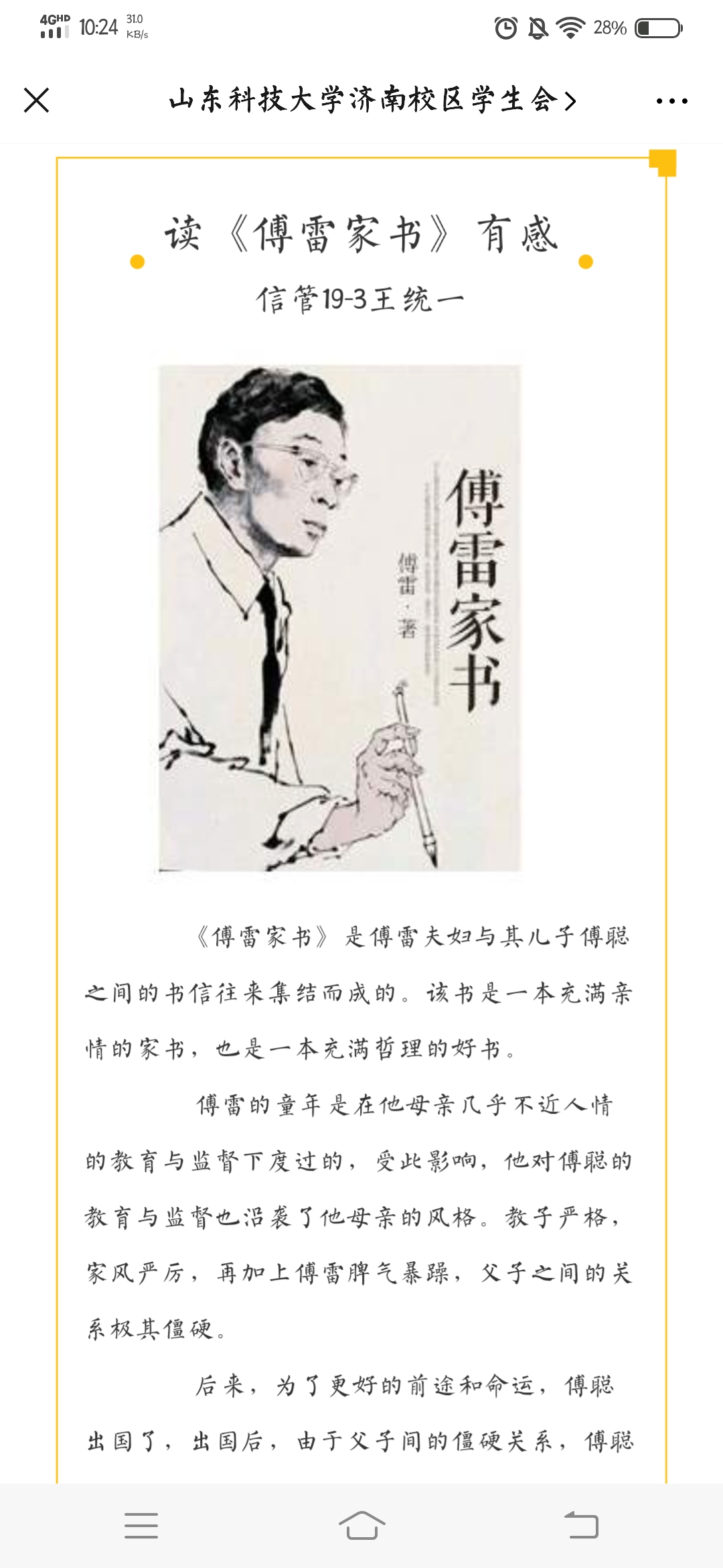 王統(tǒng)一同學以“涓涓教誨,殷切期望,拳拳舐犢情”為主題分享了《傅雷家書》的感悟。家書中父母的諄諄教誨,孩子與父母的真誠交流,親情溢于字里行間,給天下父母子女強烈的感染啟迪,同時也讓他更加深刻理解了對父母所給予自己的愛;