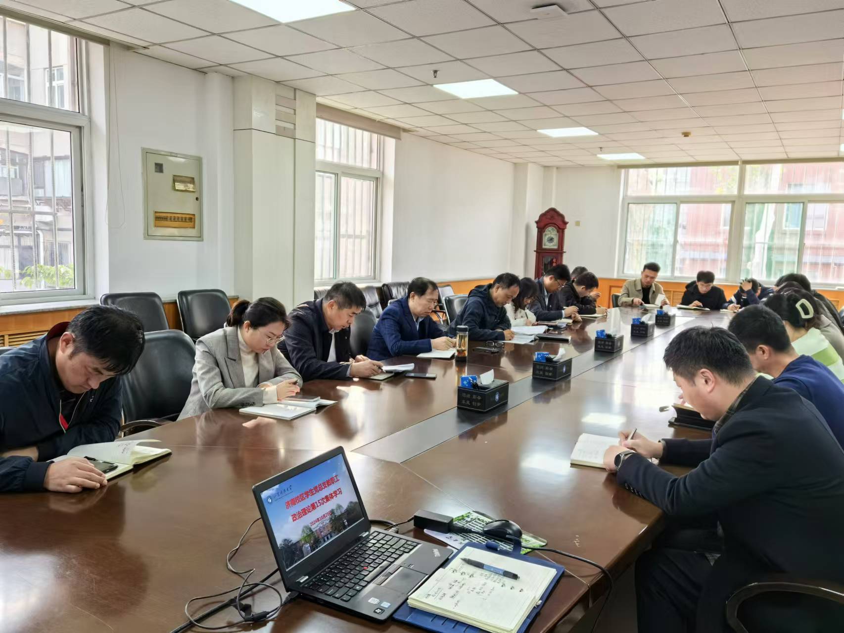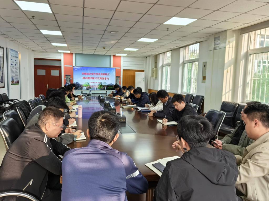 10月29日上午,濟(jì)南校區(qū)學(xué)生黨總支全體教職工在圖書館會(huì)議室開展2024年第十五次集中學(xué)習(xí)。濟(jì)南校區(qū)黨委副書記兼學(xué)團(tuán)工作部主任、學(xué)生黨總支書記毛慶東主持學(xué)習(xí)活動(dòng)。