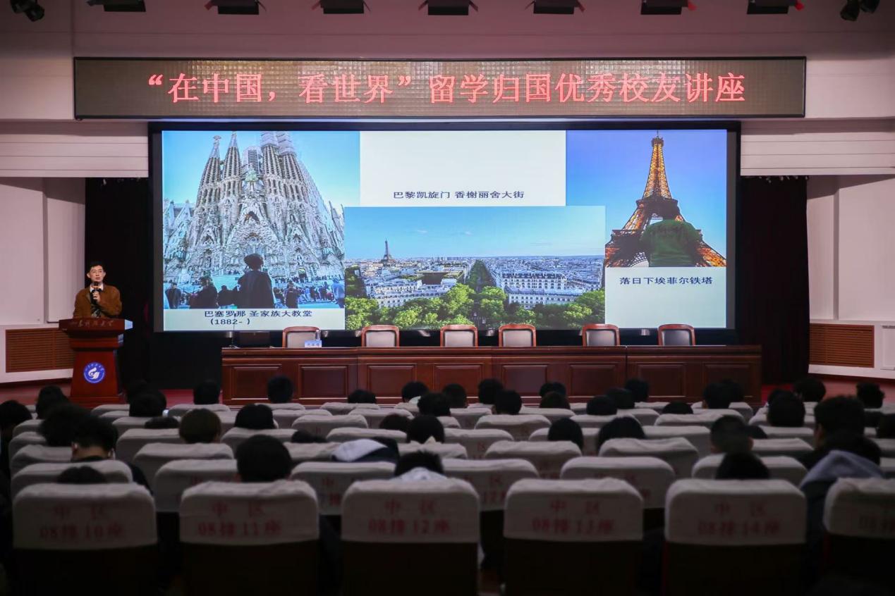 11月24日,第十五屆大學(xué)生英語文化節(jié)----留學(xué)經(jīng)驗(yàn)分享活動(dòng)在圖書館報(bào)告廳舉行。2018級國貿(mào)專業(yè)校友倪振博受邀作了題為“在中國,看世界”的精彩講座,校區(qū)相關(guān)學(xué)團(tuán)工作干部、全體2024級學(xué)生參加。