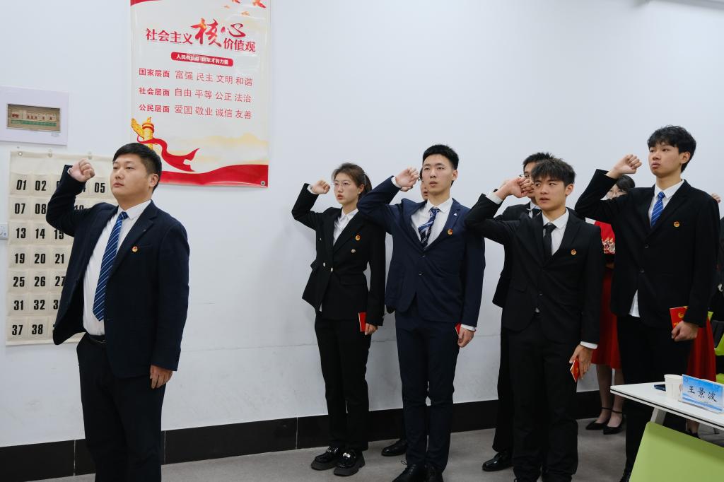 韓冰宣讀了2024年新團員名單。馬力為新團員佩戴團徽,王景波為新團員頒發(fā)團章,王龍帶領(lǐng)新團員宣誓,肖憶同學作為新團員代表發(fā)言。