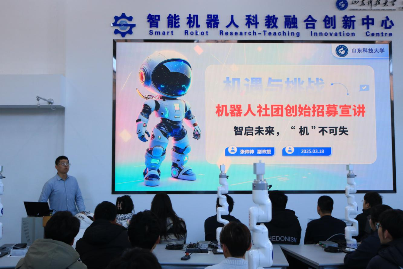 3月18日,山東科技大學(xué)濟(jì)南校區(qū)學(xué)生會(huì)在智能機(jī)器人科教融合創(chuàng)新中心舉辦第三十三期嵙科博學(xué)講堂,正式啟動(dòng)機(jī)器人社團(tuán)創(chuàng)始招募?;顒?dòng)以"AI機(jī)器人校園社團(tuán)新紀(jì)元,邀你來開啟"為主題,吸引眾多學(xué)生參與,張帥帥老師擔(dān)任主講嘉賓。