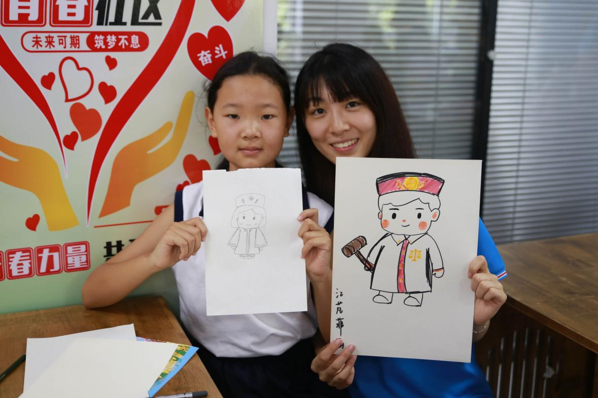 圖為團(tuán)隊成員與課堂上的小同學(xué)共同繪畫非遺小法官