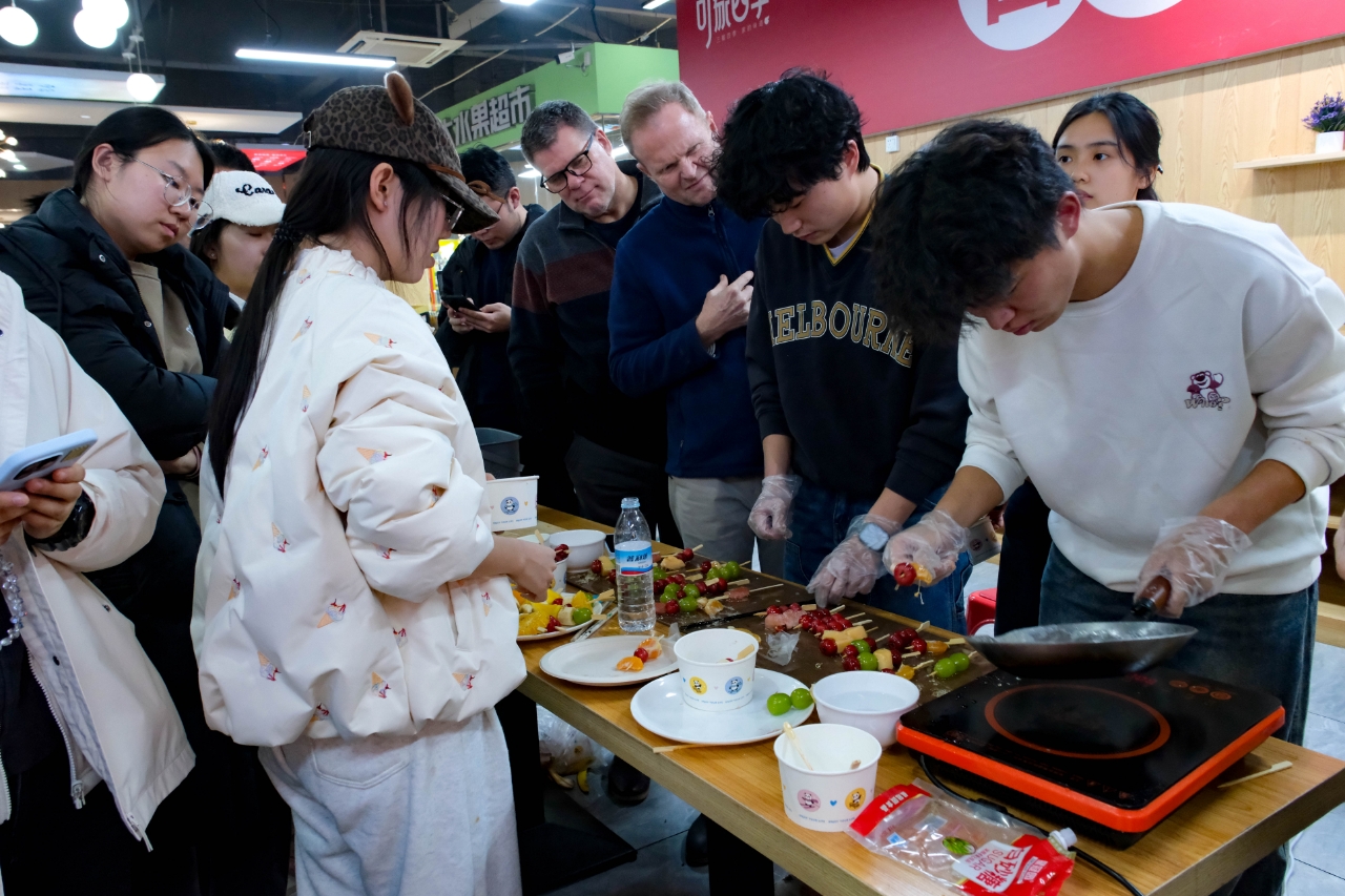 活動(dòng)伊始,中英雙語主持的開場(chǎng)致辭生動(dòng)傳遞了“推動(dòng)中外文明交流互鑒”的核心主旨,為現(xiàn)場(chǎng)營造出熱烈融洽的氛圍。在糖葫蘆制作環(huán)節(jié),同學(xué)們嚴(yán)格遵循傳統(tǒng)工藝,依次完成鮮果甄選、清洗串制、糖漿熬制等工序,并耐心協(xié)助外方教師體驗(yàn)“火候把控”“糖絲拉制”等關(guān)鍵步驟。師生們共同協(xié)作,最終制作出晶瑩剔透的糖葫蘆,品嘗后紛紛稱贊其“色香味俱佳”,既展現(xiàn)了中華飲食的視覺美感,又蘊(yùn)含豐富的味覺層次,充分彰顯了傳統(tǒng)文化的獨(dú)特魅力。