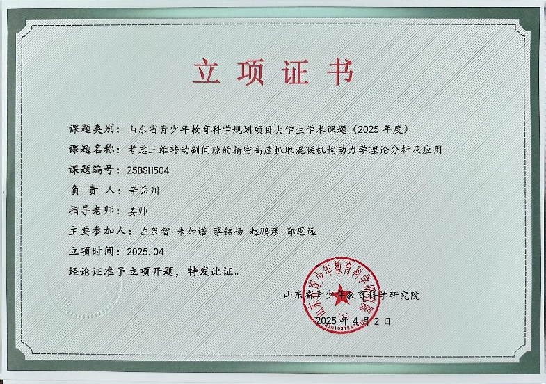 此外,機(jī)械與自動(dòng)化系智能制造技術(shù)實(shí)驗(yàn)室成員2022級(jí)機(jī)械電子工程專(zhuān)業(yè)本科生辛岳川、朱加諾等積極參與大學(xué)生學(xué)術(shù)課題,成功申請(qǐng)立項(xiàng)山東省青少年教育科學(xué)規(guī)劃項(xiàng)目大學(xué)生學(xué)術(shù)課題(指導(dǎo)教師:姜帥)。