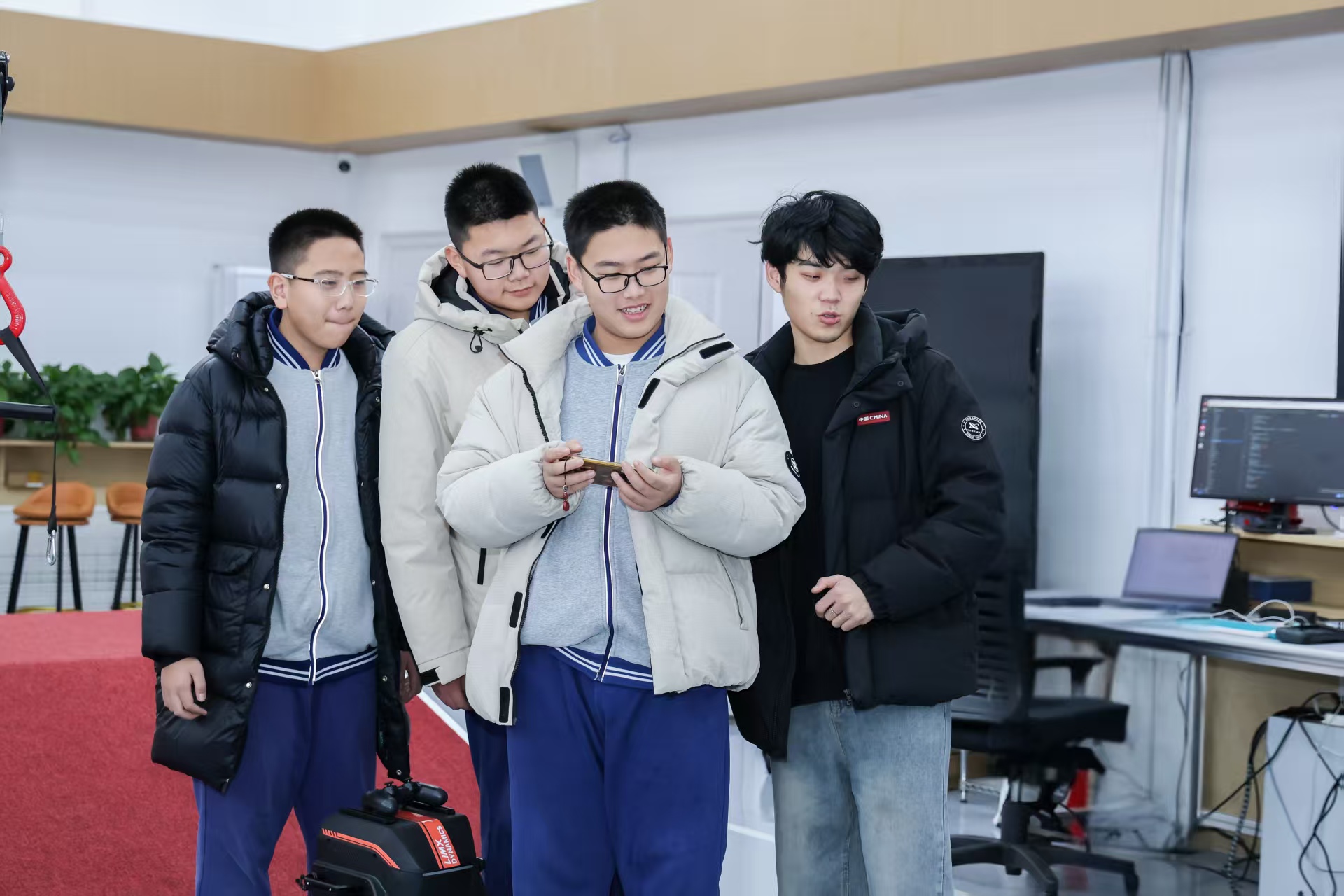 研學(xué)最后一站,同學(xué)們走進(jìn)智能機(jī)器人科教融合創(chuàng)新中心。校區(qū)智能機(jī)器人社團(tuán)負(fù)責(zé)人吳豪威結(jié)合自身學(xué)習(xí)與參賽經(jīng)歷,為同學(xué)們介紹了實驗室各類機(jī)器人設(shè)備的功能特性,以及參與機(jī)器人大賽的收獲與感悟。在技術(shù)演示環(huán)節(jié),Unitree G1人形機(jī)器人、Unitree Go2-W四足機(jī)器人、TRON1多形態(tài)機(jī)器人依次亮相,靈活的動作展示全方位呈現(xiàn)了智能機(jī)器人技術(shù)的前沿發(fā)展水平,贏得同學(xué)們陣陣喝彩。部分同學(xué)親手操控,讓機(jī)器人完成一系列復(fù)雜動作,直觀感受智能科技的神奇,進(jìn)一步點燃了探索科技前沿、追逐科學(xué)夢想的熱情。