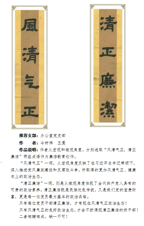 即日起,機關黨總支將擇優(yōu)展示部分廉潔教育作品,力求通過此次展示,讓廣大師生感受廉潔文化熏陶,增強廉潔自律意識,筑牢拒腐防變的思想防線,營造校區(qū)崇清尚廉的濃厚氛圍,為建設廉政機關,推動校區(qū)高質(zhì)量發(fā)展注入新活力。