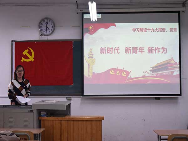 本次黨課學(xué)習(xí)主要圍繞十九大報(bào)告內(nèi)容及黨章修正案展開。齊斯文通過引導(dǎo)在座學(xué)生黨員描繪暢想“兩個一百年”的美好愿景,啟發(fā)思考在新時(shí)代下青年人擔(dān)負(fù)的歷史使命,將大家引入黨課第一章內(nèi)容“十九大會議主題、議程、意義”,通過援引十九大山東代表團(tuán)一線代表參會經(jīng)歷,生動講述了“初心與使命”的內(nèi)涵,并強(qiáng)調(diào)要內(nèi)化于心、化于行。隨后,齊斯文通過回顧十九大部分節(jié)選的黨章修正案,對比分析了黨在不同時(shí)期下的理論創(chuàng)新及豐碩實(shí)踐成果。她具體講解了黨章新增設(shè)的主要內(nèi)容,使在場黨員系統(tǒng)、清晰的了解了中國特色社會主義新時(shí)代背景下黨的指導(dǎo)思想、基本方略、黨的建設(shè),以及社會主要矛盾、中國特色社會主義文化的戰(zhàn)略地位等內(nèi)容,明確了在實(shí)現(xiàn)中華民族偉大復(fù)興中國夢的奮斗目標(biāo)中青年人大有可為、大有