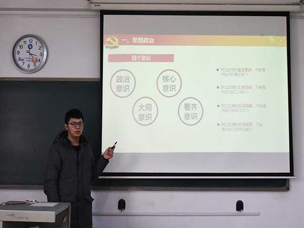 入黨積極分子答辯分為自我闡述和提問兩個(gè)環(huán)節(jié)。在自我闡述環(huán)節(jié)中,入黨積極分子從思想政治、執(zhí)行紀(jì)律、道德品行和發(fā)揮作用四個(gè)方面,就自身學(xué)習(xí)、工作和生活情況進(jìn)行了詳實(shí)的匯報(bào)。提問環(huán)節(jié)中,評(píng)委從多角度對(duì)入黨積極分子進(jìn)行了提問,其中既包括黨的基本理論知識(shí)、對(duì)黨的認(rèn)識(shí)等,也包括對(duì)時(shí)事熱點(diǎn)的看法。答辯會(huì)結(jié)束之后,評(píng)委老師對(duì)本次答辯作了總結(jié)和點(diǎn)評(píng),糾正了部分積極分子片面的思想認(rèn)識(shí),并對(duì)他們提出了殷切的希望,指出入黨是個(gè)漫長(zhǎng)的過程,需要大家不斷修正和完善,應(yīng)做到“勤于修心,勤于修德,勤于修行,勤于修廉”,在修身之余更應(yīng)胸懷大志,實(shí)現(xiàn)齊家治國(guó)平天下的政治抱負(fù)。