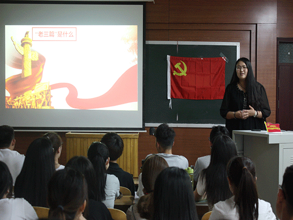 首先,王曉瓊圍繞《為人民服務(wù)》、《愚公移山》和《紀(jì)念白求恩》等毛澤東經(jīng)典“老三篇”文章展開講解。她著重講解了為人民服務(wù)這一精神宗旨,并強(qiáng)調(diào)“為人民服務(wù)”是適應(yīng)時(shí)代要求而產(chǎn)生的一種新的道德思想。隨后,她從八路軍戰(zhàn)士張思德、2012年感動(dòng)中國(guó)十大人物陳家順和“5.12”地震中做出無(wú)私奉獻(xiàn)的王洪發(fā)等人的英勇事跡入手,向大家展現(xiàn)出一代代共產(chǎn)黨人不畏艱險(xiǎn),勇于擔(dān)當(dāng)?shù)母锩瘛P鞚嵰浴拔蚣t歌之魂,憶黨路建設(shè)”為主題,帶領(lǐng)大家欣賞了紅歌《讓我們蕩起雙槳》和《大中國(guó)》等歌曲,并為大家講述了其背后的故事及社會(huì)意義,使同學(xué)們感受到紅色歌曲中蘊(yùn)含的強(qiáng)大精神力量,增強(qiáng)了大家的民族自信心和自豪感。最后,冷思敏為大家講述了中國(guó)人民解放軍開國(guó)之將孔慶德的光輝事跡,并播放了電視劇《人民的名義》節(jié)選片段,宣講在熱烈的氣氛中結(jié)束。
