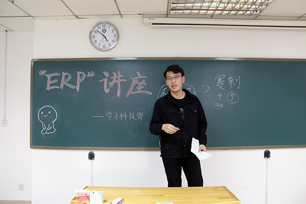 會計學15級褚延熙以PPT的形式介紹了ERP沙盤模擬比賽的具體規(guī)則和流程,他分別從組織準備工作、模擬企業(yè)概況、初始狀態(tài)設定、企業(yè)運營規(guī)則、實際模擬鍛煉等方面對比賽進行了詳細的介紹。他指出,在組織準備工作中,需要進行對職能人員進行明確定位,而在模擬企業(yè)概況方面,關鍵在于對公司的發(fā)展進行合理的分析與評估。隨后,金融學15級渠浩然以生動的語言進行了比賽經(jīng)驗與技巧的分享。