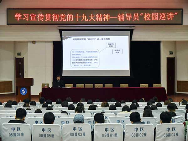 為緊跟新時代步伐,領(lǐng)悟新時代思想,激勵大學(xué)生努力奮斗,創(chuàng)造美好未來,12月21日與12月25日晚,濟南校區(qū)于圖書館報告廳舉辦學(xué)習(xí)宣傳貫徹十九大精神“輔導(dǎo)員巡講”報告會,優(yōu)秀輔導(dǎo)員宣講團成員、財經(jīng)系黨總支副書記胡寶征作了題為《奮力開創(chuàng)新時代中國特色社會主義美好未來》的報告,財經(jīng)系2015級、2017級全體學(xué)生聆聽了報告。