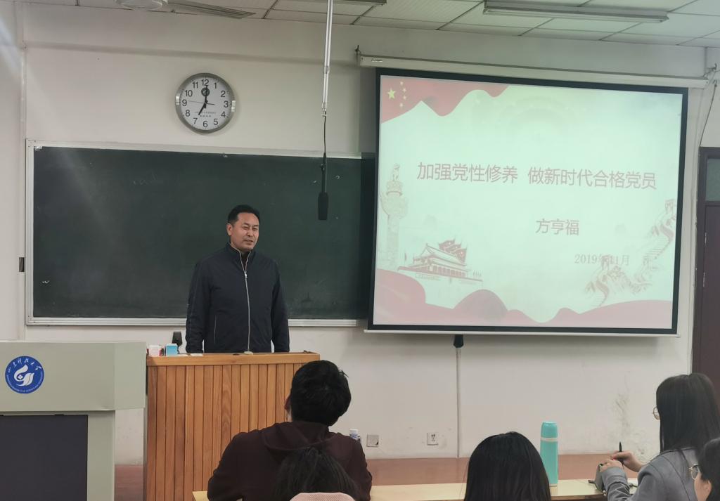 方亨福以“加強(qiáng)黨性修養(yǎng),做新時代合格黨員”為題為電氣信息系黨總支、后勤管理處黨總支全體黨員講黨課