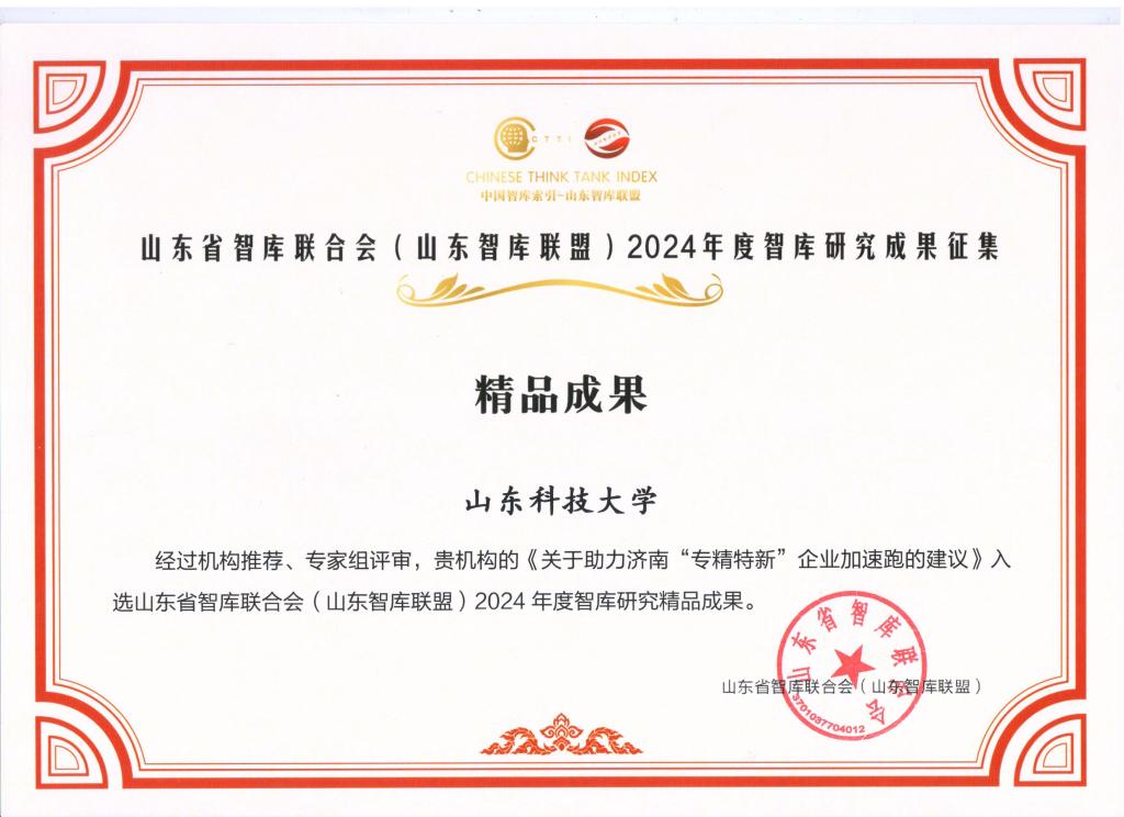 近日,在山東省智庫聯(lián)合會(山東智庫聯(lián)盟)2024年度智庫研究成果評選中,校區(qū)孔寧寧副教授申報的《關(guān)于助力濟(jì)南“專精特新”企業(yè)加速跑的建議》脫穎而出,入選智庫研究精品成果。申報項目在眾多參評成果中成功躋身前30%,獲得智庫聯(lián)盟高度評價。