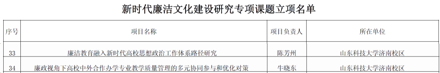 近日,山東科技大學(xué)-青島西海岸新區(qū)廉潔文化研究中心“新時代廉潔文化建設(shè)研究專項(xiàng)”立項(xiàng)名單公布,牛曉東申報(bào)的《廉政視角下高校中外合作辦學(xué)專業(yè)教學(xué)質(zhì)量管理的多元協(xié)同參與和優(yōu)化對策》和陳芳州申報(bào)的《廉潔教育融入新時代高校思想政治工作體系路徑研究》獲批立項(xiàng)。
