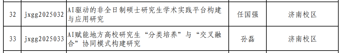 近日,學(xué)校組織開展了2025年校級研究生教育教學(xué)改革項目申報與評審工作。校區(qū)教師任國強主持的《AI驅(qū)動的非全日制碩士研究生學(xué)術(shù)實踐平臺構(gòu)建與應(yīng)用研究》以及孫磊主持的《AI賦能地方高校研究生“分類培養(yǎng)”與“交叉融合”協(xié)同模式構(gòu)建研究》成功獲得立項。