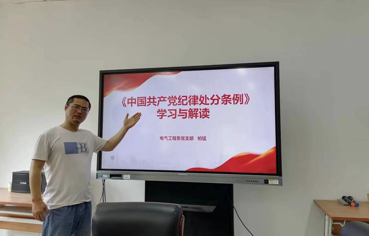 電氣工程系黨支部書記柏猛以《<中國(guó)共產(chǎn)黨紀(jì)律處分條例>學(xué)習(xí)與解讀》為題講黨課,條例修改的背景意義、條例修改的主要內(nèi)容、新條例的亮點(diǎn)、貫徹執(zhí)行條例等方面帶領(lǐng)支部黨員一起學(xué)習(xí)解讀。